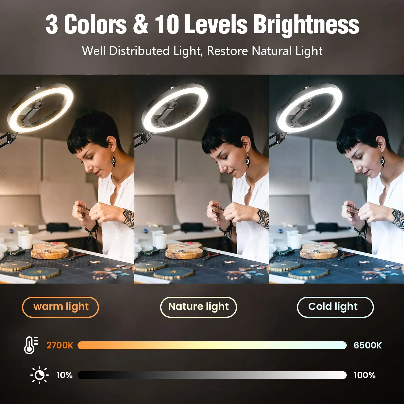【50 RGB Dynamic Modes and 3 Normal Colors】This selfie ring light for desk comes with a phone holder can easily adjust 3 color modes (warm, cool, and natural), each mode has 12 levels of brightness. Very suitable for photographers, YouTubers, Vloggers, TikTokers and more.