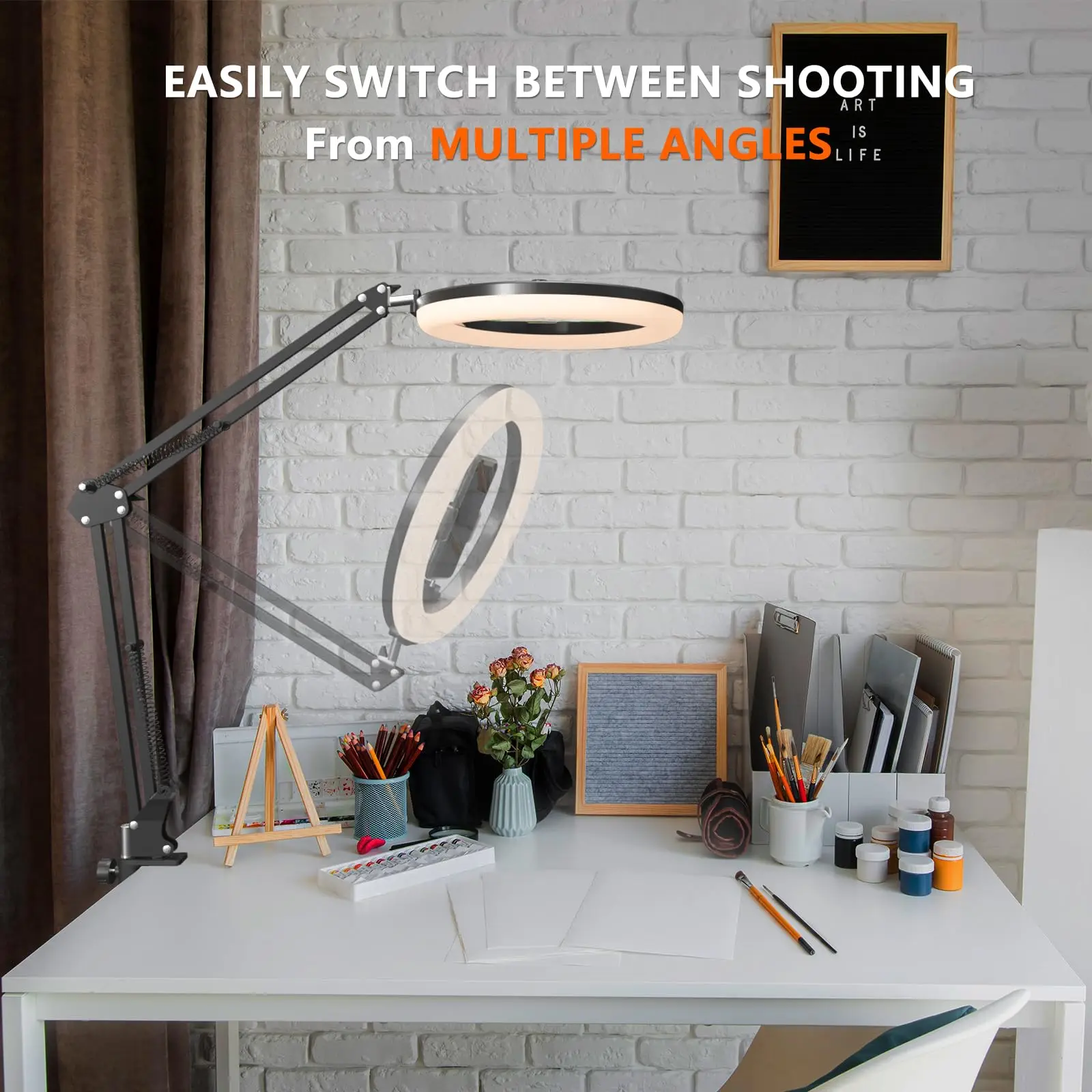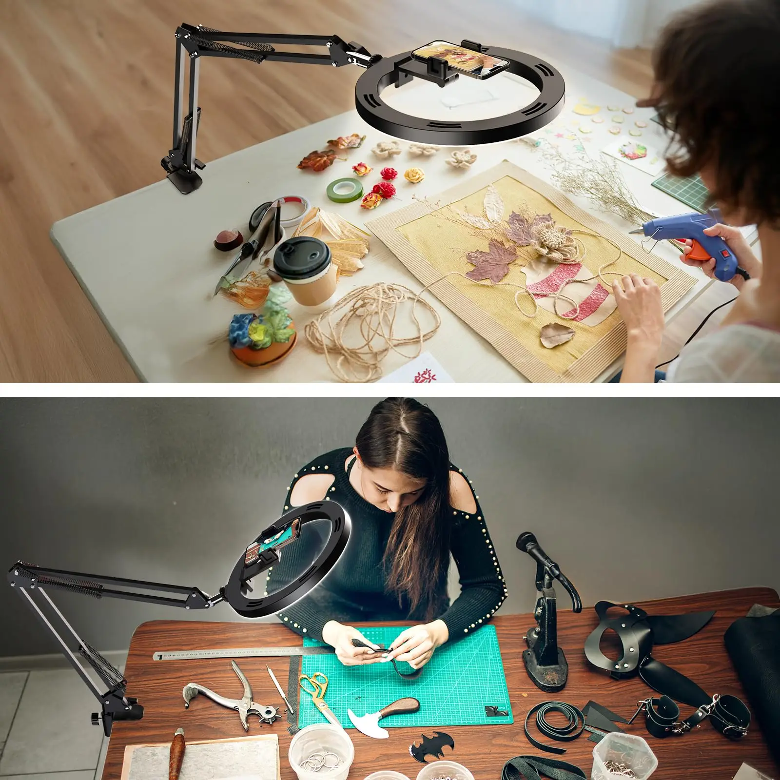 【Ring Light for Desk 】Compared to the traditional ring light with stand, this overhead phone mount not only upgrades the size of the selfie light, but also solves the problem of the light above the phone being usually blocked by the phone and the shadow appearing below the phone.